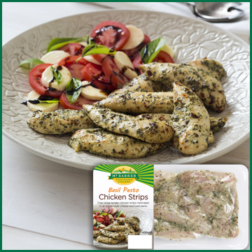 Free range tender chicken strips marinated in an Italian style cheese and basil pesto. Family friendly flavour!